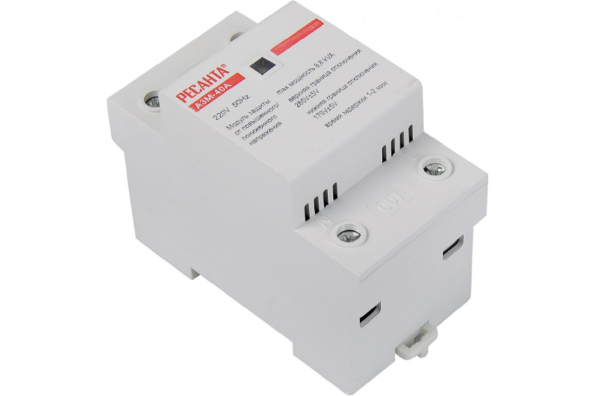 Реле напряжения РЕСАНТА АЗМ-40A - автоматическое устройство защиты от повышенного/пониженного напряжения, в основном используемое для низковольтных распределительных линий для бытовых и аналогичных целей, автоматически обнаруживает сбой, связанный с повышением или понижением напряжения, и отключается, при восстановлении нормальных условий на линии, автоматически включается.