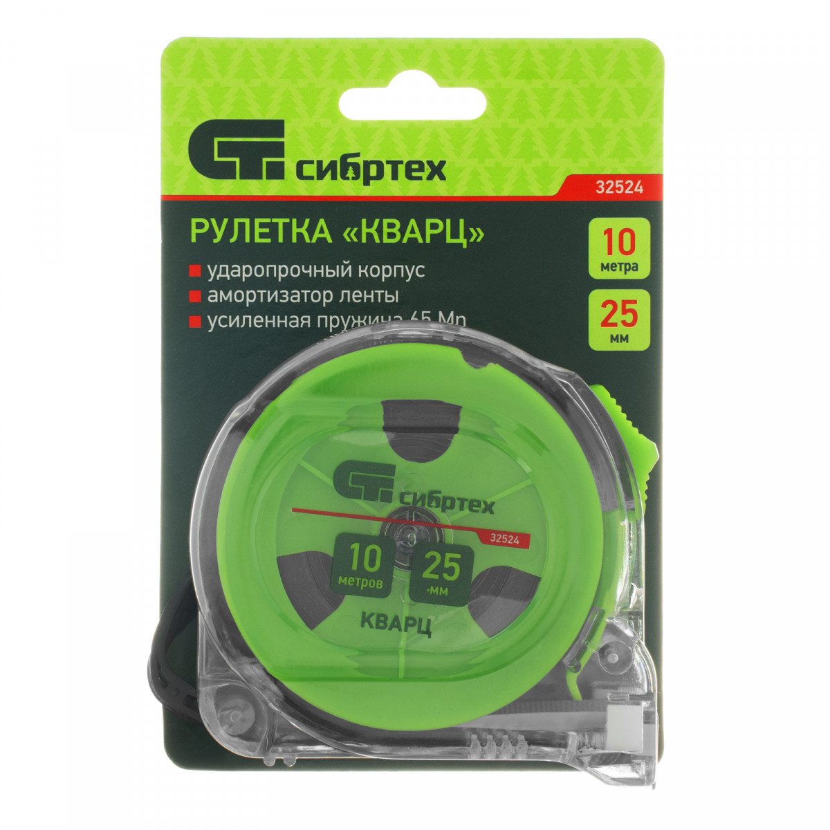 Рулетка Сибртех Кварц 32524 с полотном размером 10 м х 25 мм, в прозрачном корпусе, с амортизатором, будет полезна для измерения длины конструкций, строительных материалов и т.д. Пригодится на строительной площадке, в гараже, мастерской и в быту.