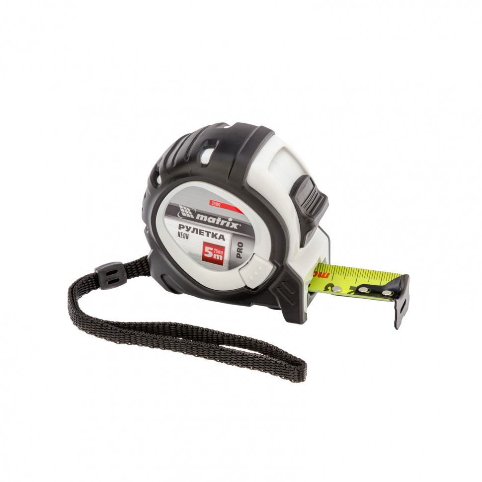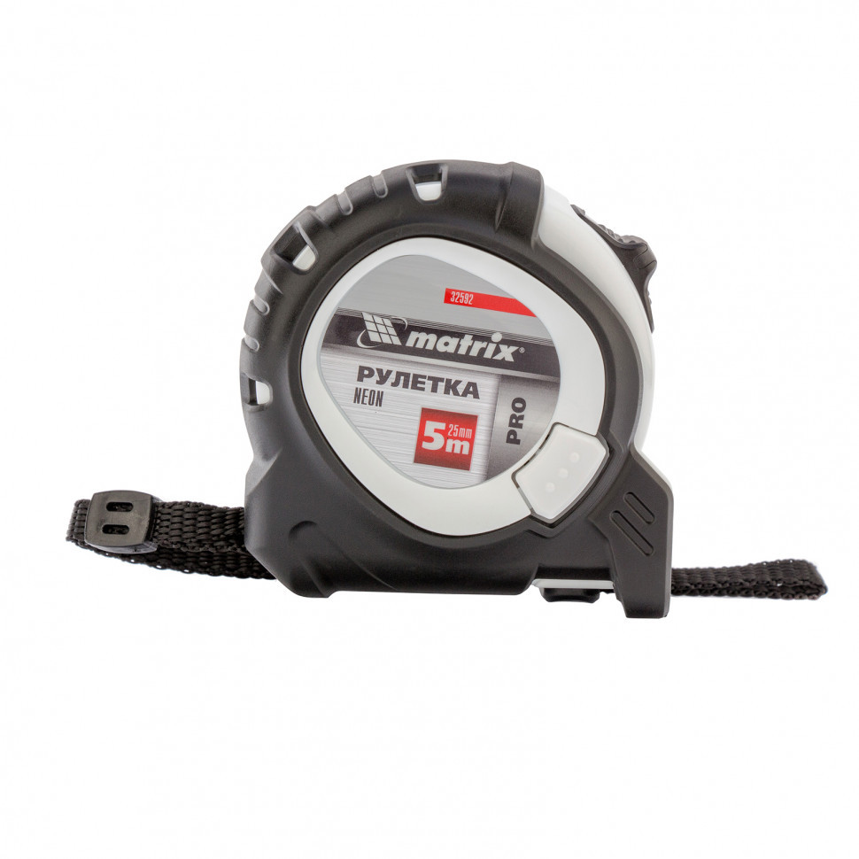 Рулетка Neon,5 м x 25 мм,обрезиненный корпус,3 фиксации,Pro Matrix