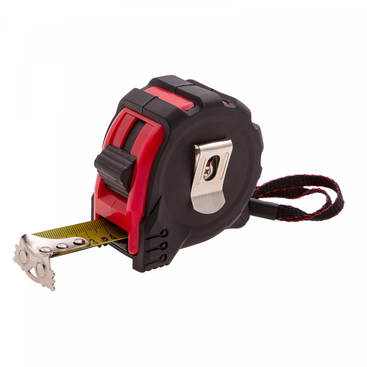 - Дополнительные возможности — шнурок для крепления на запястье уменьшает риск падения рулетки, на боковой поверхности имеется зажим для фиксации рулетки на поясном ремне.