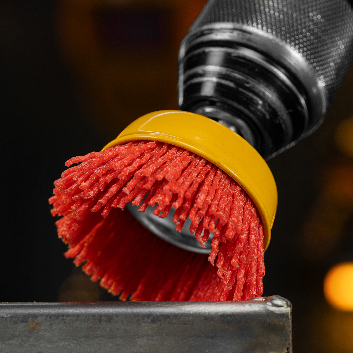- Высокое качество обработки — в отличие от металлической, нейлоновая щетина не оставляет следов на деревянных поверхностях.