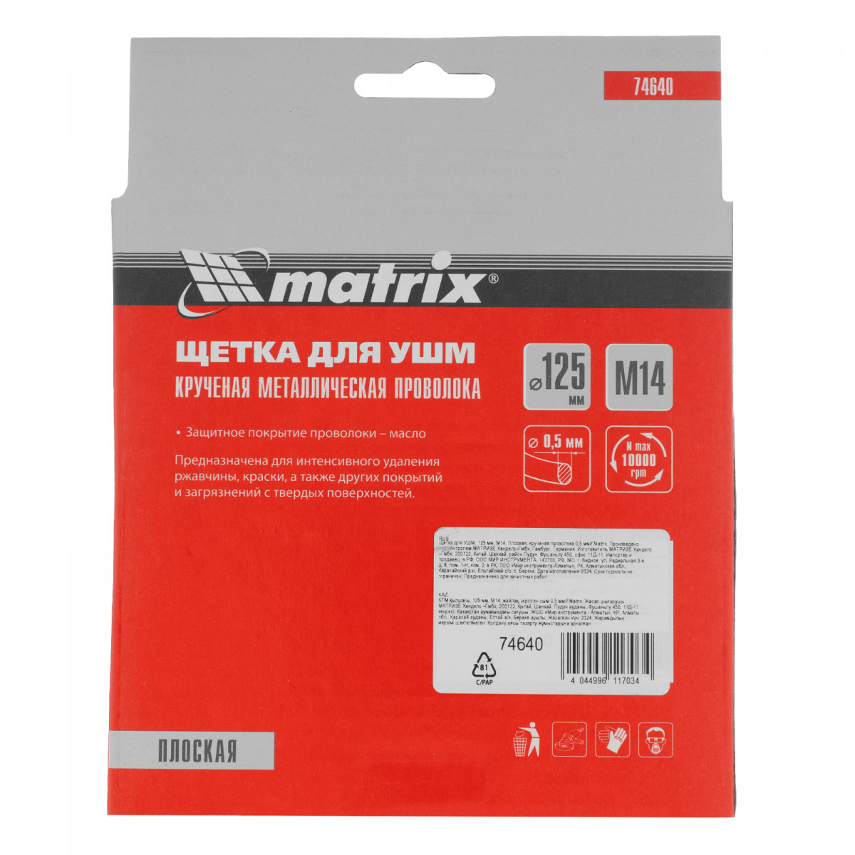 Плоская щетка Matrix 74640 диаметром 125 мм, с щетиной из крученой проволоки толщиной 0,5 мм и гайкой М14, — оснастка для УШМ, предназначенная для грубой (черновой) обработки поверхностей. Максимально допустимая скорость вращения шпинделя — 10000 об/мин. Щетка позволяет снять толстый слой ржавчины, лакокрасочных покрытий, загрязнений, а также зачистить сварные швы. Плоская форма удобна для обработки углов, изгибов и других труднодоступных мест.