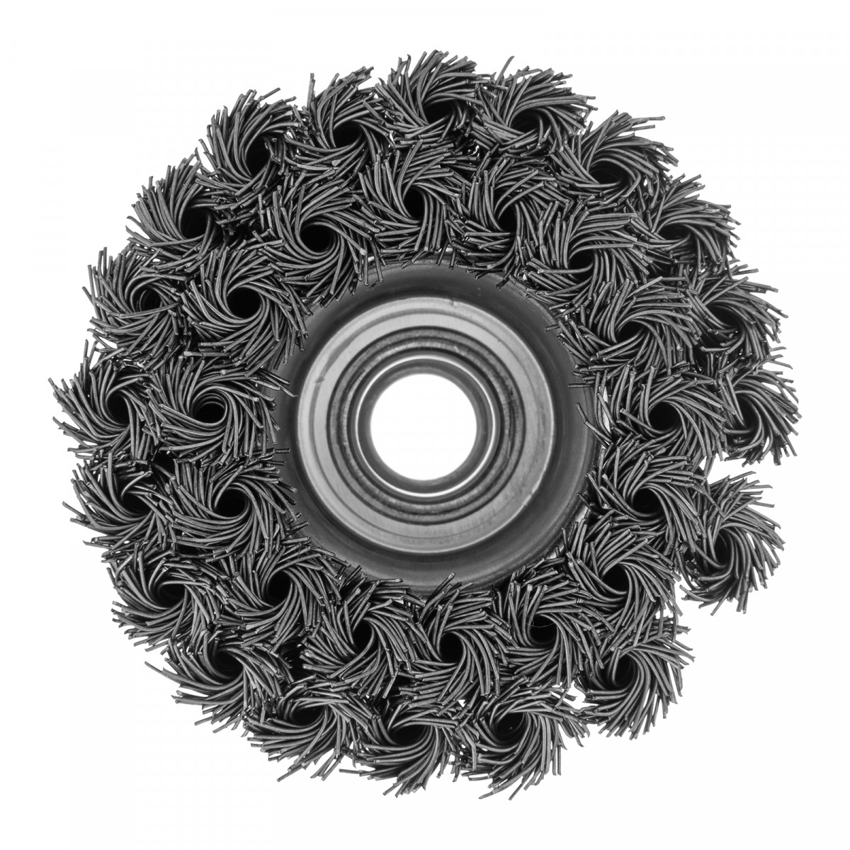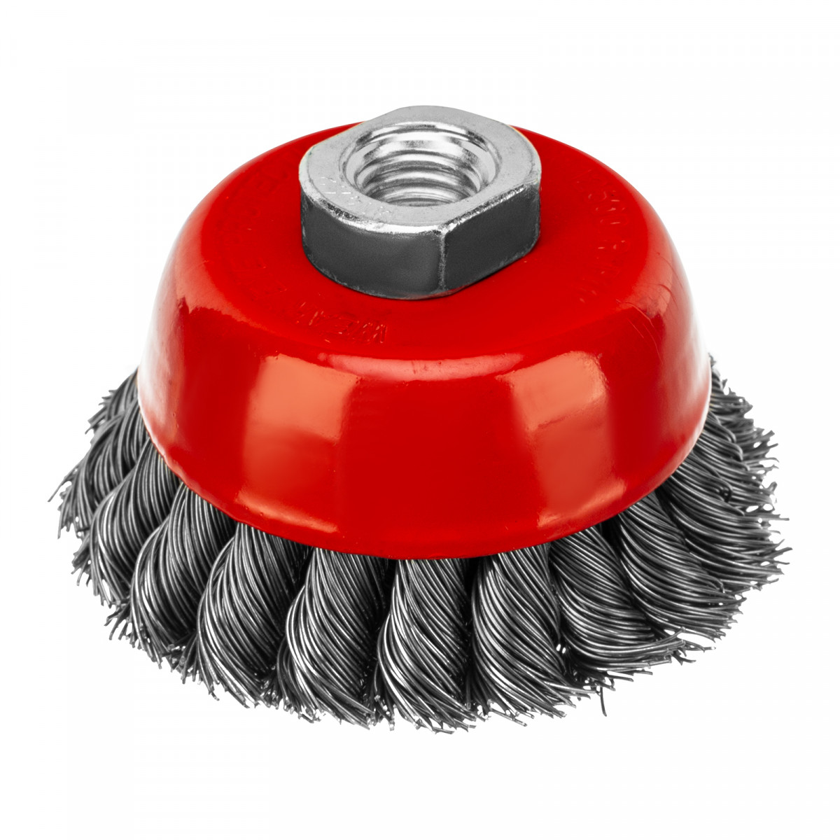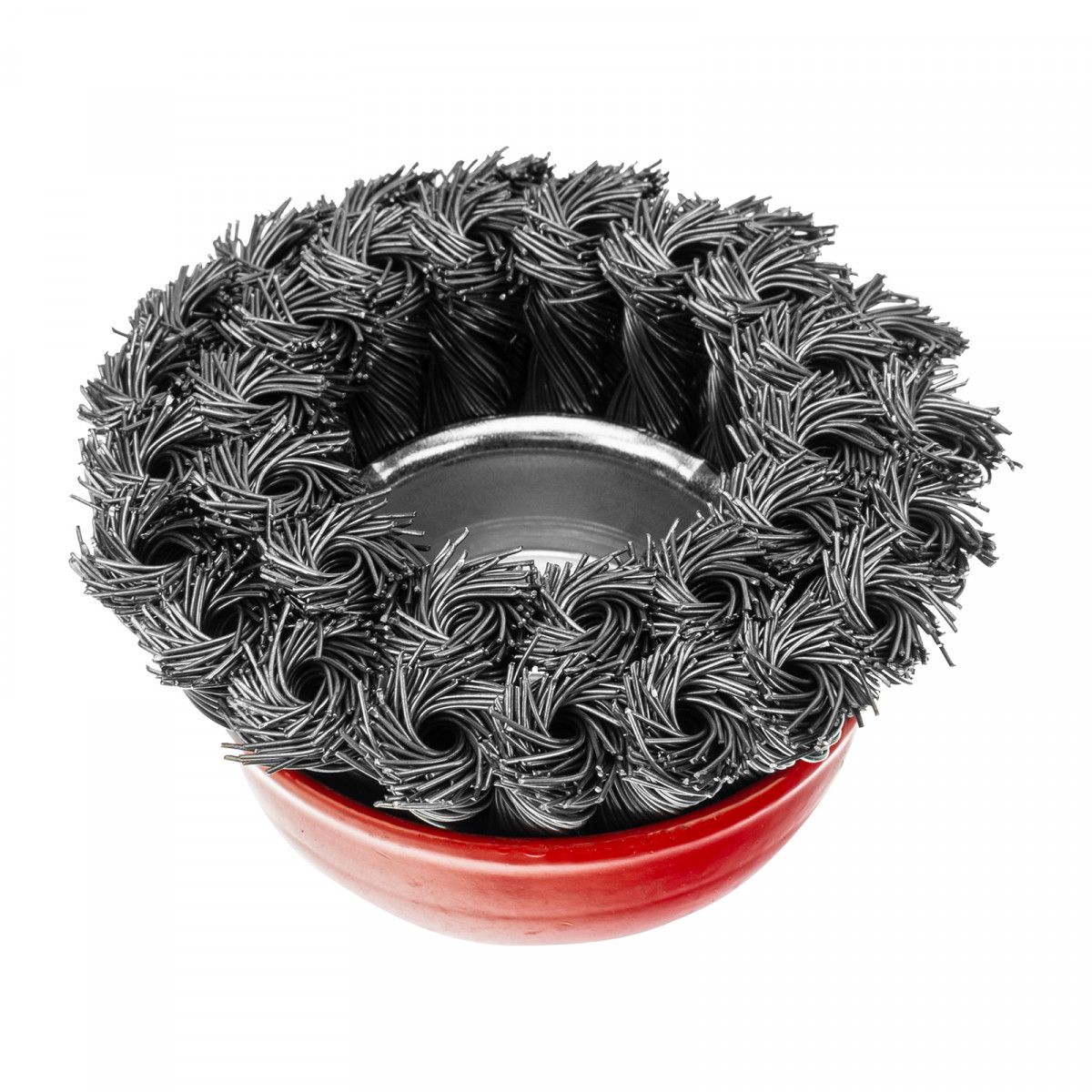 Двухрядная щетка Matrix «Чашка» 74681 диаметром 75 мм, с щетиной из крученой проволоки толщиной 0,5 мм, устанавливается на вал углошлифовальной машины с помощью гайки М14. Рекомендованная максимальная скорость вращения — до 12500 об/мин. Оснастка оптимальна для грубой (черновой) обработки: снятия старого слоя лакокрасочного покрытия и ржавчины, удаления загрязнений, зачистки сварных швов. Эффективно справляется с зачисткой больших поверхностей, подходит для выполнения работ повышенной сложности.
