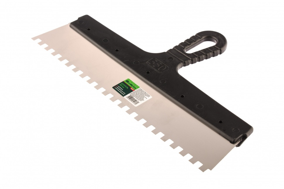 Шпатель Сибртех 85477 шириной 350 мм, из нержавеющей стали, с пластмассовой ручкой и зубьями 8 х 8 мм, применяется для равномерного нанесения клея при укладке мелкоформатной плитки, мозаики и т.д. Квадратные зубья облегчают нанесение клеевого состава, позволяя ровно и экономно распределять его по поверхности. Зубья размером 8 х 8 мм рассчитаны на плитку площадью 400-900 см2.Упругое полотно — при изгибающих нагрузках шпатель быстро восстанавливает свою форму.Коррозионная стойкость — рабочее полотно выполнено из нержавеющей стали.Надежный хват — инструмент имеет эргономичную рельефную ручку.Удобство — рукоятка выполнена с небольшим наклоном для комфортного нанесения и выравнивания растворов.Практичное хранение — в рукоятке предусмотрено отверстие для подвешивания шпателя.
