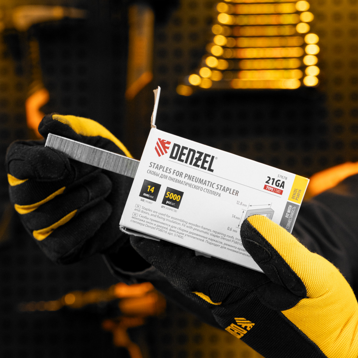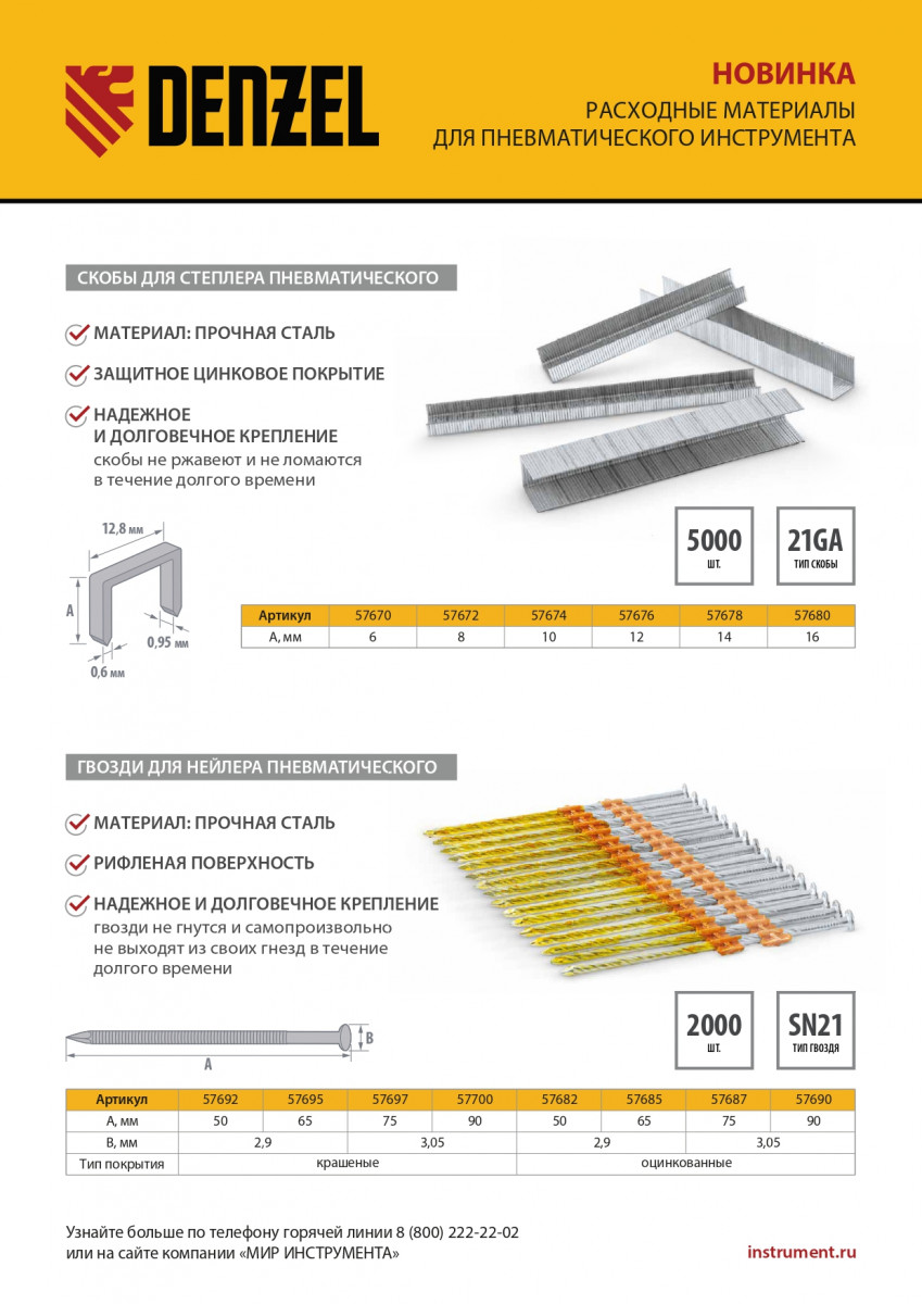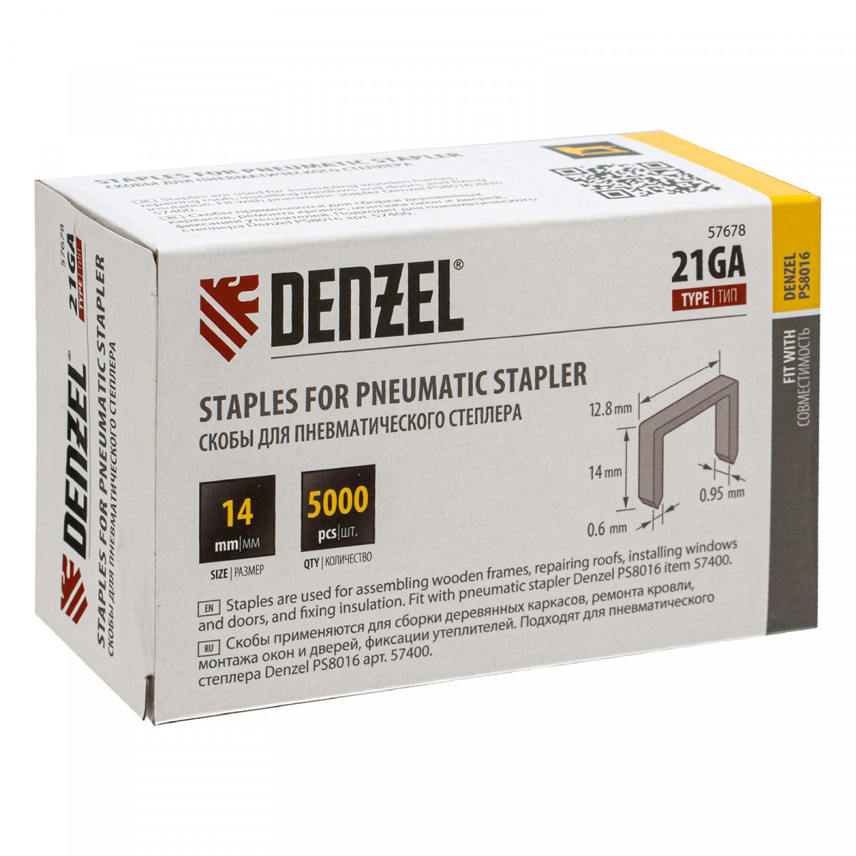 Скобы 21GA для пнев. степл., 14мм, шир. - 0,95мм, тол. - 0,6мм, шир. скобы - 12,8мм, 5000шт Denzel