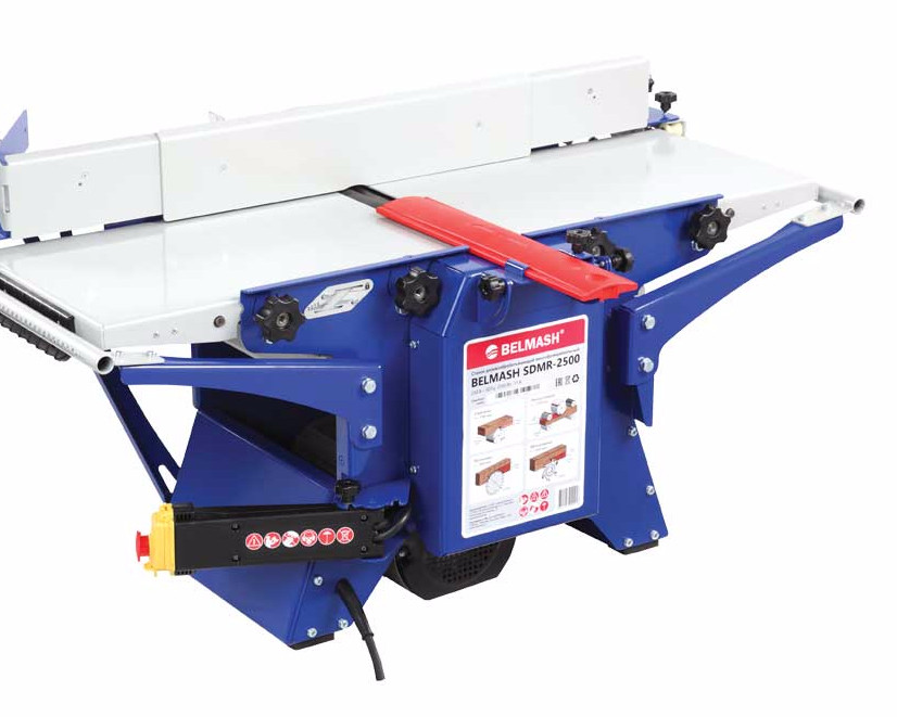Деревообрабатывающий станок многофункциональный Белмаш SDMR-2500 используется для универсальной обработки деревянных заготовок. Основные функции изделия: распиловка, строгание, рейсмусование, фрезерование. Небольшие размеры позволяют использовать оборудование в домашних мастерских и на производствах без подключения к силовым линиям 380 В. Комплектация включает в себя необходимое оборудование для проведения работ всех видов. Настольная конструкция обладает необходимым весом и жесткостью, чтобы справляться с вибрацией при работе. Распиловку можно вести под углом до 45 градусов. Для пиления предусмотрен рабочий стол размерами 827х528 мм. Габариты стола для строгания составляют 912х284 мм. При рейсмусовании обеспечивается автоматическая подача заготовки со скорости до 6 метров в минуту. Для фрезерования используются фрезы диаметром 125 мм. Габариты, мм1030 х 680 х 570