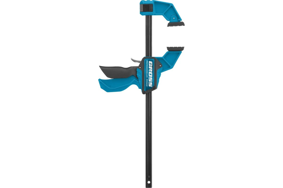 Реечная быстрозажимная струбцина пистолетного типа, с пластиковым корпусом, с шириной зажима 300 мм, с пошаговым механизмом, используется для зажимания заготовок при выполнении столярных или монтажных работ.