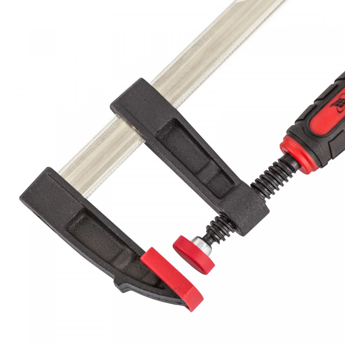 F-образная струбцина Matrix 20404 размером 250 х 50 х 310 мм используется для зажима металлических, деревянных и других заготовок для их последующей обработки или сборки. Представляет собой штангу, на которой установлено 2 кронштейна — неподвижный и подвижный. Деталь помещается между ними и прижимается к губкам при помощи винтового зажима с трапециевидной резьбой. Подвижный кронштейн позволяет регулировать величину захвата, которая может достигать 250 мм. Струбцину применяют для выполнения слесарных и столярных работ.