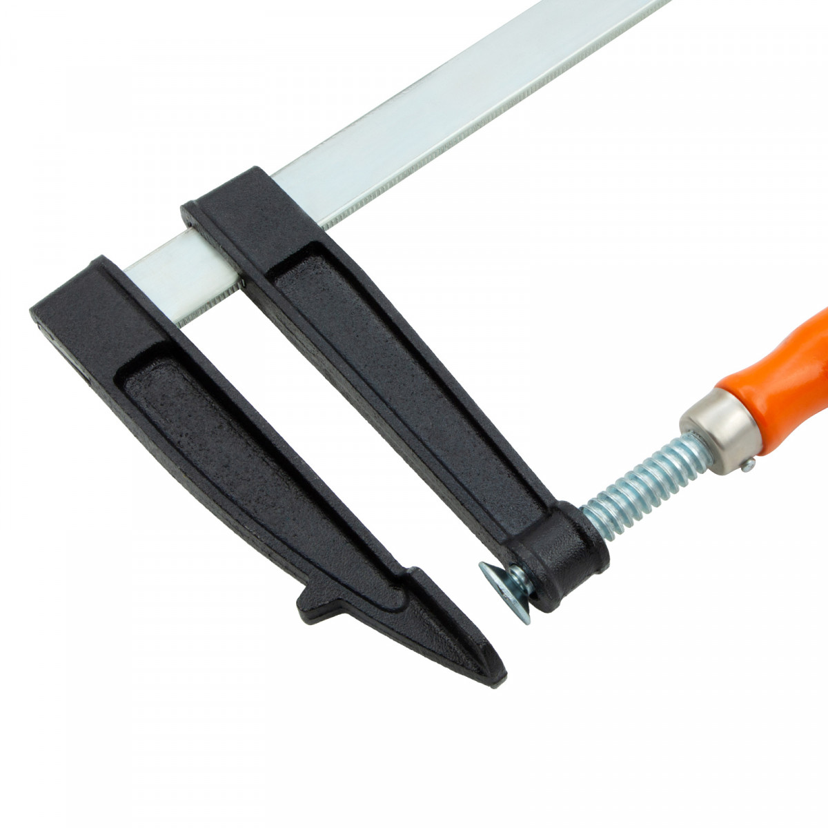F-образная струбцина Sparta 204415, 500 х 120 х 570 мм, используется в столярном и слесарном деле и позволяет фиксировать заготовки из металла, древесины и других материалов для их соединения или обработки. Деталь помещают между губками, одна из которых подвижна и служит для регулировки величины захвата. Винтовой зажим позволяет прикладывать значительное усилие для надежной фиксации. Защитные накладки предотвращают повреждение детали. Элементы конструкции выдерживают высокую температуру, поэтому струбцина подходит для проведения сварочных работ, при этом пластиковые накладки необходимо снять.