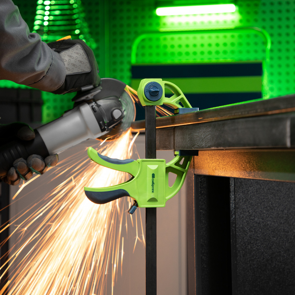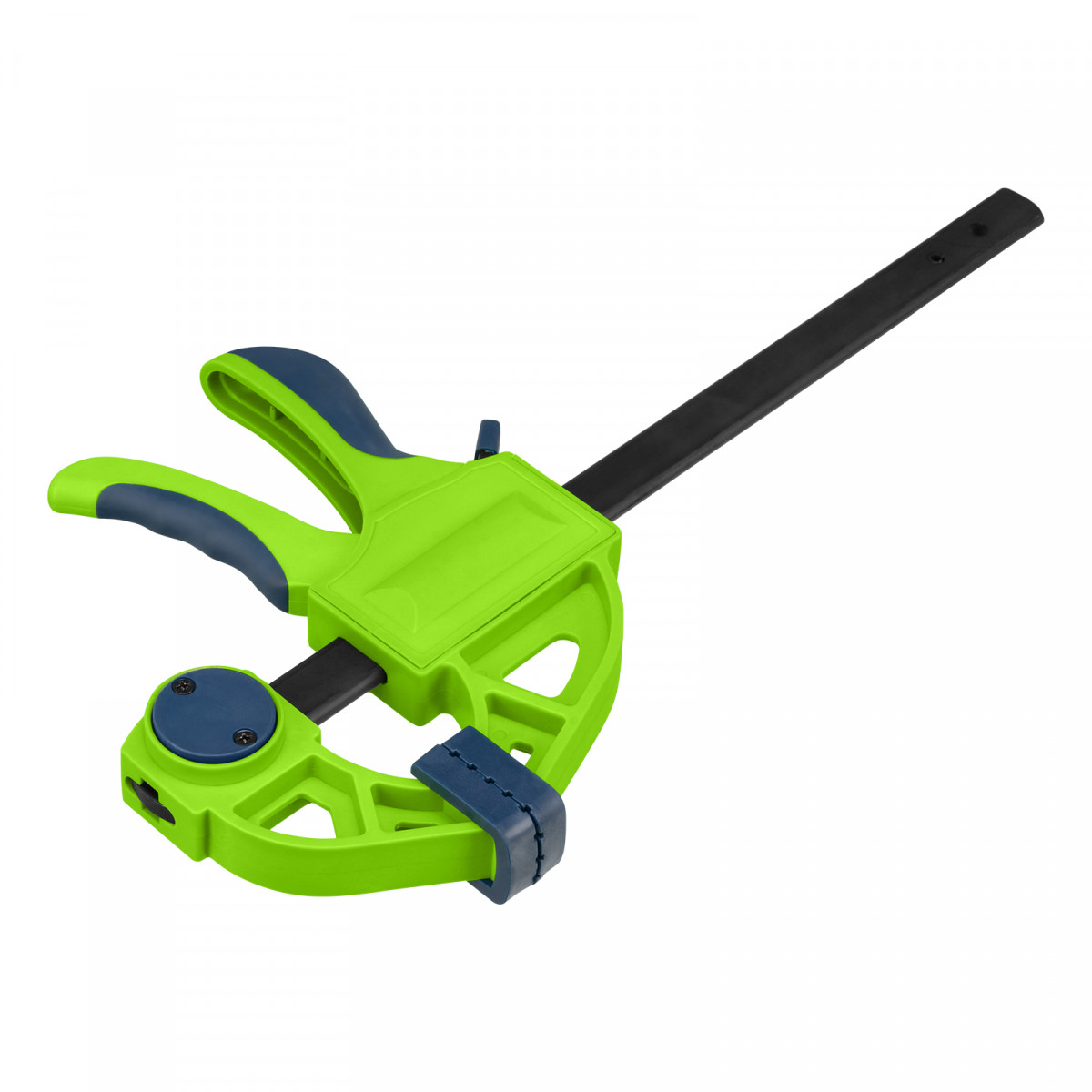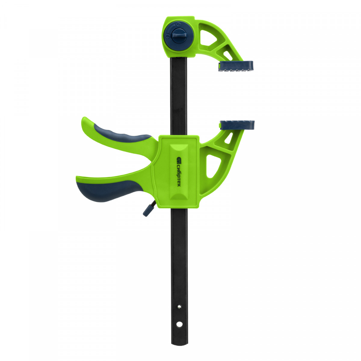F-образная быстрозажимная струбцина Сибртех 20563 длиной 360 мм, с шириной и глубиной зажима 150 и 70 мм соответственно, в пластиковом корпусе, с фиксатором и двухкомпонентной рукояткой, позволяет зажимать заготовки для их дальнейшей обработки или сборки. Помогает решать множество задач благодаря оптимальной глубине зажима. Пластинчатый механизм пошагово перемещает подвижную губку вдоль направляющей до достижения максимально плотного захвата детали. Фиксатор препятствует движению губки в обратную сторону. Струбцина пригодится в столярной мастерской, а также будет полезна в быту.