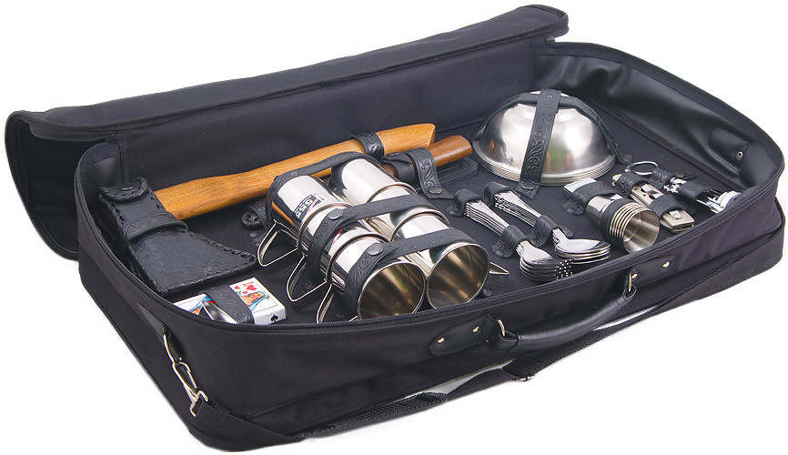 Стопки 6 шт. - пищевая, нержавеющая сталь.Вилка 6 шт.Ложка 6 шт.Нож 1 шт. - нержавеющая сталь 65Х13.Нож складной 1 шт. - нержавеющая сталь.Тарелка 6 шт. - пищевая, нержавеющая сталь.Кружки 6 шт. - пищевая, нержавеющая сталь.Половник - пищевая, нержавеющая сталь.Топор - высокоуглеродистая сталь.Доска разделочная - натуральное дерево.Ножовка по дереву.Штопор.Шампура 6 шт. - пищевая, нержавеющая сталь.Мангал большой, разборный.Зажигалка кремневая, бензиновая.Колода игральных карт.Сумка тканевая, размер 65х35х15 см.