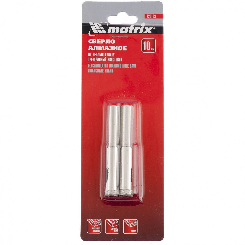 Сверло алмазное по керамограниту, 10 х 67 мм, трехгранный хвостовик, 2 шт Matrix