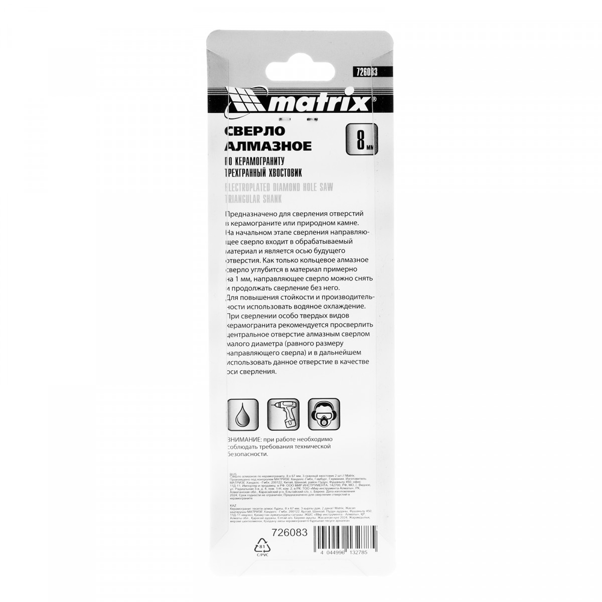 Сверло алмазное по керамограниту, 8 х 67 мм, трехгранный хвостовик, 2 шт Matrix