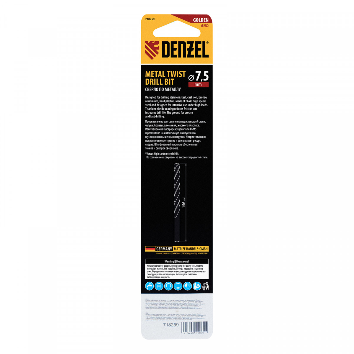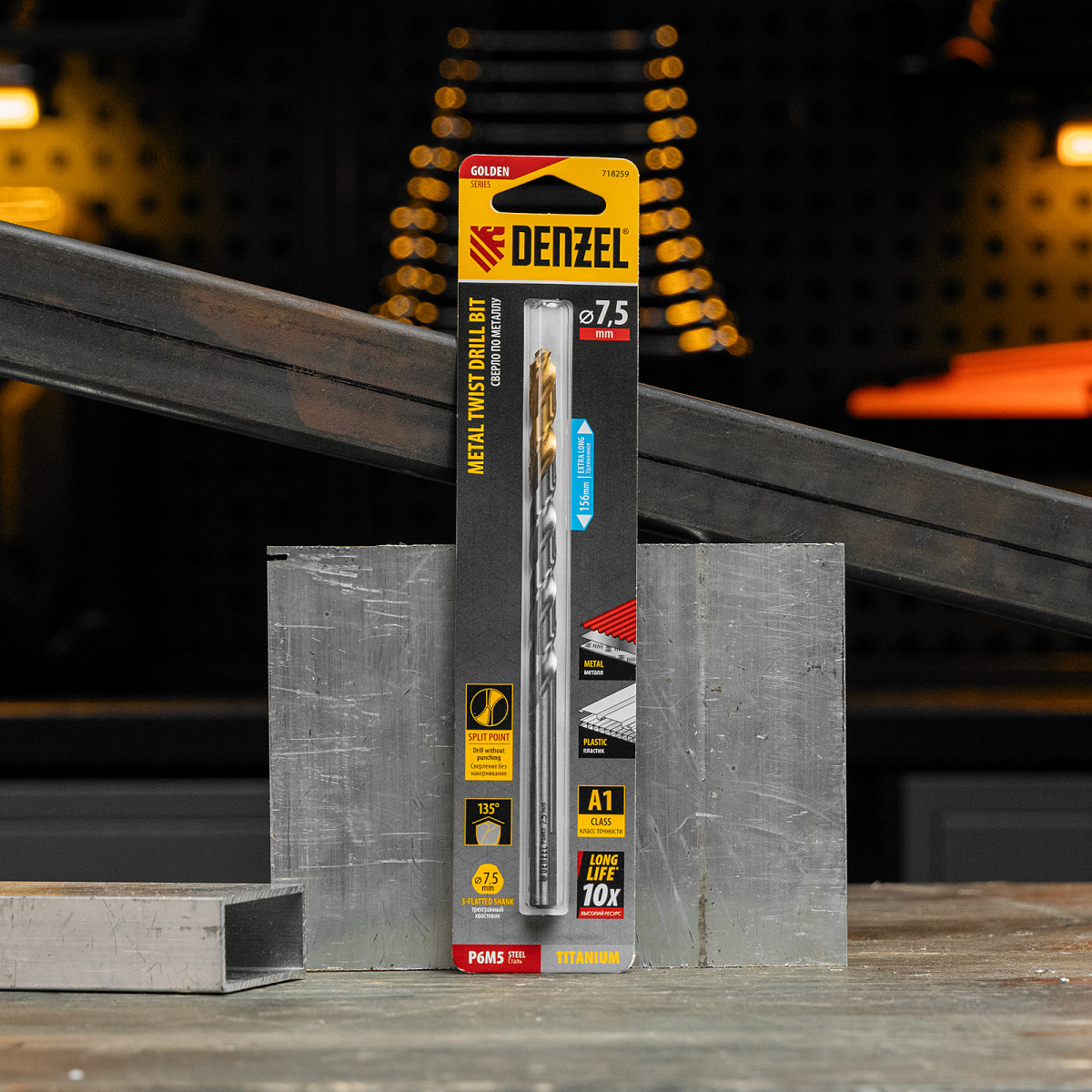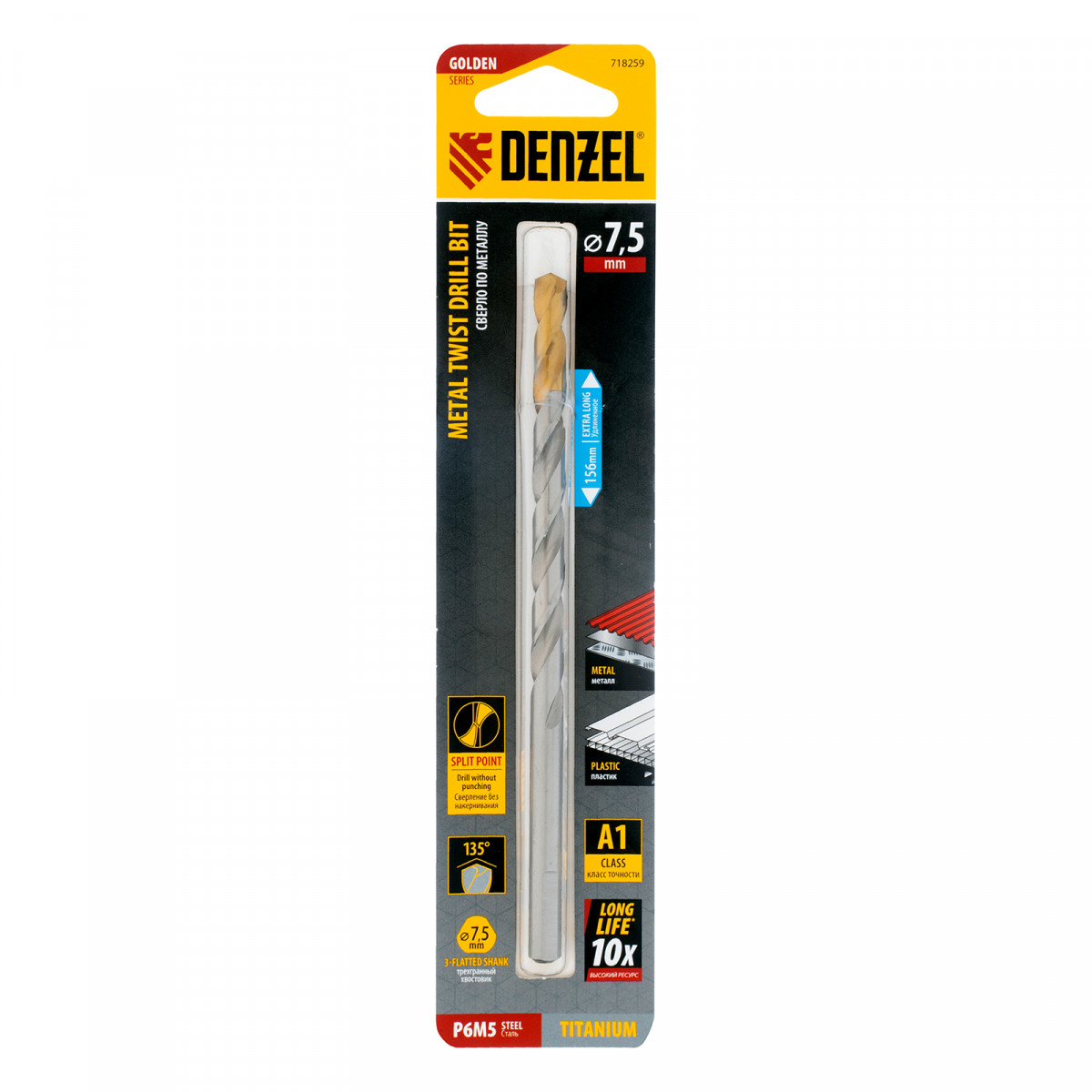 Сверло спиральное по металлу 7,5 х 156 мм, Р6М5, Golden Tip, удлиненное Denzel