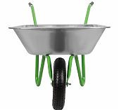 Тачка садов-строительная одноколесная предназначена для перевозки строительных материалов, а так же различных грузов при проведении сельскохозяйственных работ. Грузоподъемность 200 кг, объем кузова 90 л. Усиленная рама с подпятником выполнена из трубы 32 мм, толщина стенки 1,5 мм, окрашена порошковой эмалью. Дуга защиты колеса не только обеспечивает безопасность работы, но и удобство при разгрузке. Упор обеспечивает удобство при разгрузке. Кузов изготовлен из оцинкованной стали, толщина 0,9 мм. Опора кузова и сварные кронштейны колеса обеспечивают большую грузоподъемность. Тачка комплектуется пневматическим колесом с камерой. Наличие двух шариковых подшипников в колесе обуславливает более легкое перемещение тачки с грузом. Диск колеса сварной.