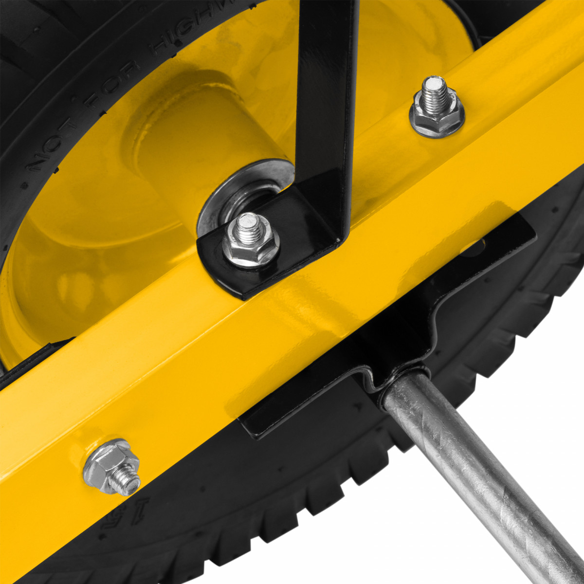- Широкие пневмоколеса с грунтозацепом и мощная рама с подпятниками предотвращают проваливание тачки в грунт.