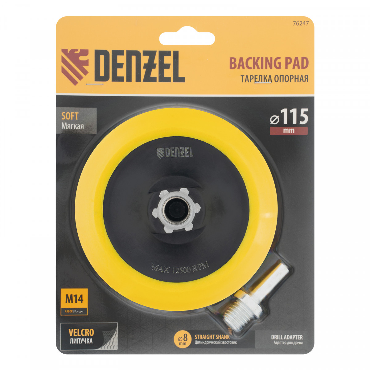 Тарелка опорная для дрели и УШМ с липучкой, 115 мм, мягкая, с адаптером c М14 на d8 Denzel