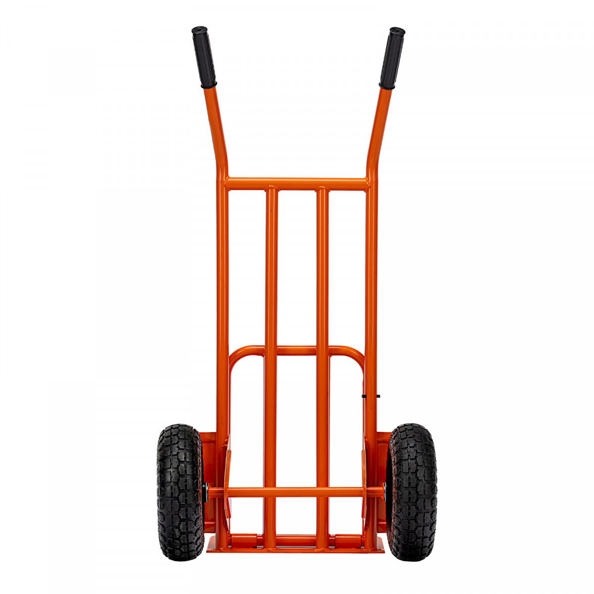 - Удобная транспортировка груза — пневматические колеса с камерами, резиновыми шинами и 2 шарикоподшипниками в каждом гасят вибрации и обеспечивают плавный ход.