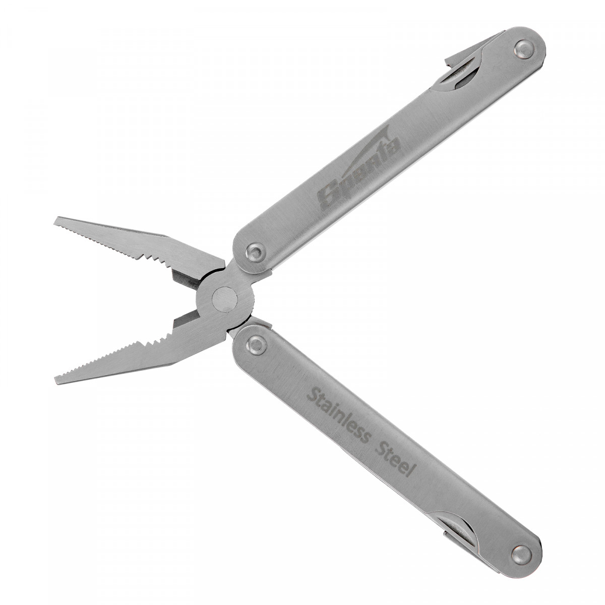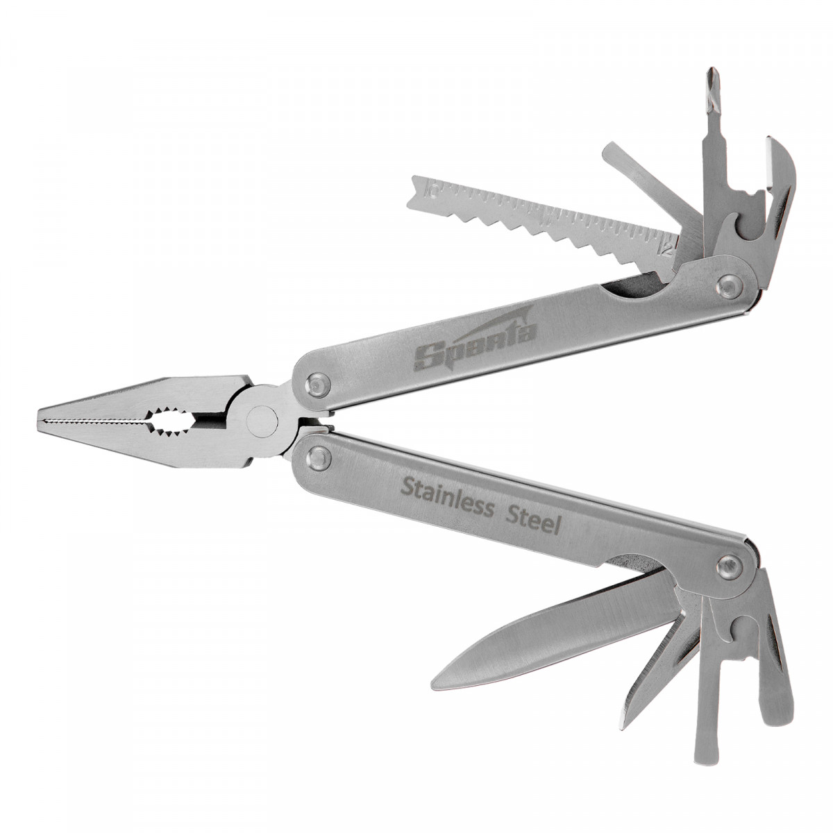 Трансформер Sparta 17610 с 15 функциями в рабочем положении имеет длину 156 мм, поставляется в чехле. Подходит для выполнения множества мелких работ: разрезания различных материалов, закручивания и откручивания крепежей, чистки рыбы, захвата или опиливания деталей, перекусывания проволоки, открывания бутылок и консервных банок. Многофункциональный инструмент пригодится на даче, в гараже, поездке, походе, на охоте или рыбалке.