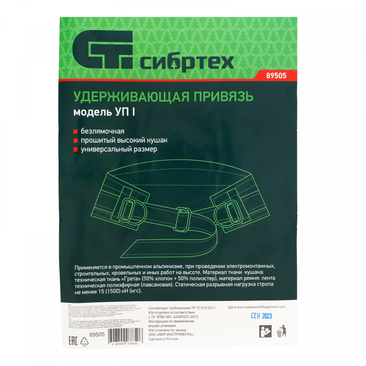 Безлямочная удерживающая привязь Сибртех 89505, модель УП I, с прошитым высоким кушаком, пригодится при выполнении монтажных, строительных, спасательных и других работ на высоте. Удерживает пользователя и не допускает его падения, что повышает безопасность работы. Предназначена для использования с цепными и капроновыми стропами.