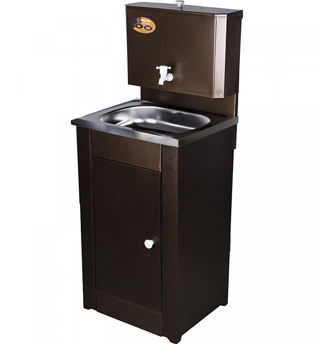 "Умывальник с подогревом, медного цвета, с металлической тумбой и нержавеющей мойкой. Умывальник ВИХРЬ отличается особой функциональностью, так как его можно установить как внутри дома, так и снаружи. Внутри тумбочки ставиться ведро или шланг для слива воды. Так как в таком умывальнике есть раковина, то его можно свободно использовать для мытья посуды.Умывальник с подогревом наиболее комфортный вариант для дачи, т.к. в случае отсутствия центрального водоснабжения, он поможет решить проблему подачи воды и сделает её горячей. Такой умывальник можно установить в летней кухне, внутри дома, на террасе, то есть там, где имеется розетка для подключения нагревательного элемента. "