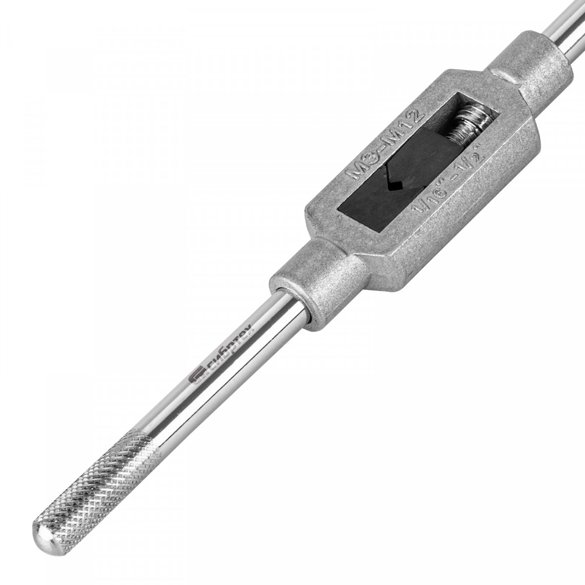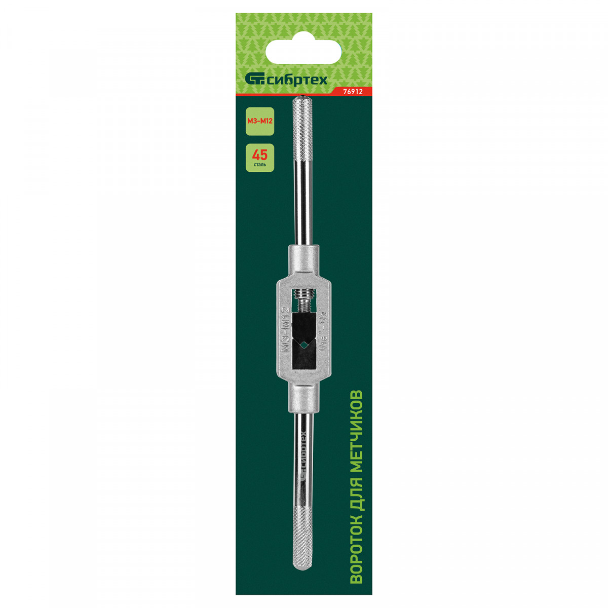 Вороток Сибртех 76912 подходит для зажима метчиков, используемых для ручного нарезания внутренней резьбы М3-М12 в отверстиях и цилиндрических деталях. Применяется во время ремонта резьбовых соединений, пригодится в мастерской или гараже.