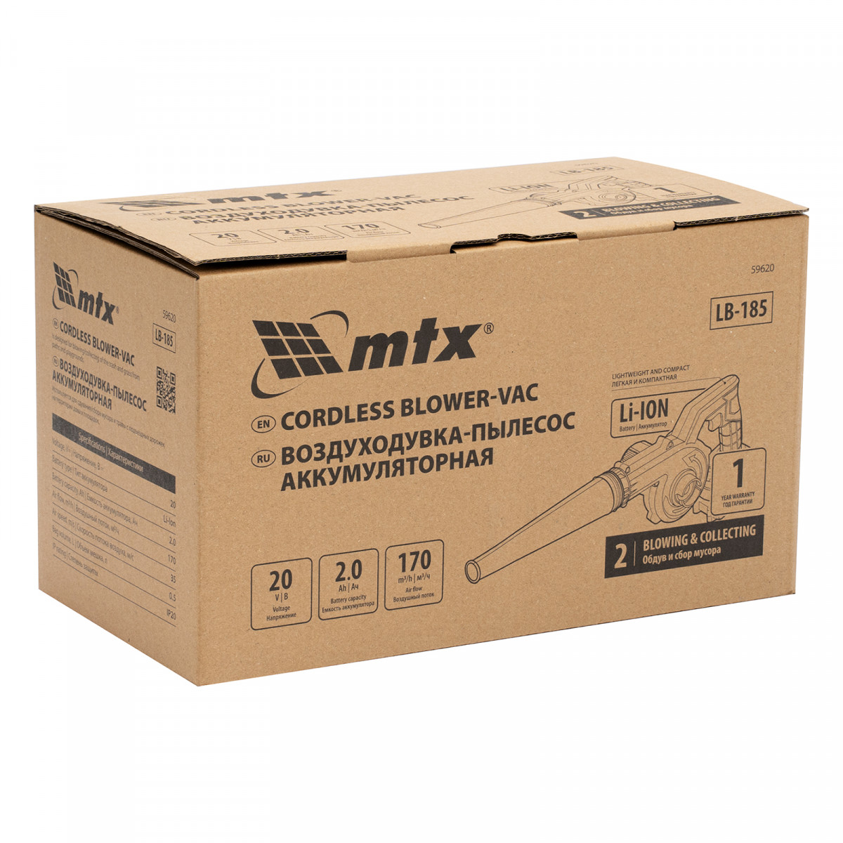 Портативная аккумуляторная воздуходувка-пылесос MTX LB-185 59620 работает от аккумулятора 20 В емкостью 2 А·ч и позволяет очистить тропинки, подъездные дорожки, территорию около дома при помощи потока воздуха 170 м³/ч, подаваемого со скоростью 35 м/с. С помощью воздуходувки можно убрать мусор, срезанную траву, опавшую листву. Функция пылесоса расширяет возможности инструмента — в этом режиме воздуходувка работает в режиме всасывания и собирает мусор в мешок объемом 0,5 л. Инструмент оптимален для бытового использования на дачном участке.