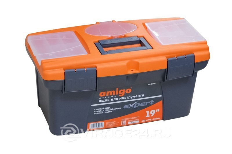 Ящик для инструмента AMIGO пластиковый, 19", 49х27,5х24 см 74781 изготовлен из прочного пластика. Имеет лоток для хранения мелких предметов, а также встроенные отсеки в крышке.