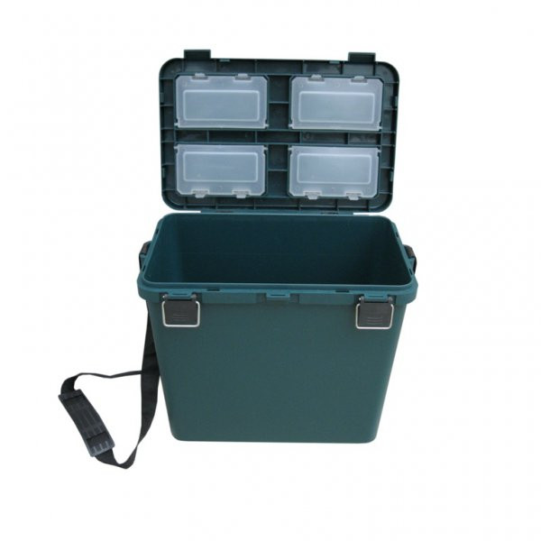 Ящик односекционный - незаменимая вещь на зимней рыбалке. Прочный корпус и наличие специальной крышки с мягким сиденьем из пенополиуретана позволяют использовать его в качестве удобного стульчика. Материал: ударопрочный и морозостойкий пластик (выдерживает температуру до - 40 градусов), не впитывающий и не пропускающий воду. Ящик выдерживает вес человека до 130 кг. Объем ящика - 19 литров (поместятся снасти, термос, еда или пойманная рыба). В крышке ящика находятся 4 отделения с крышечками для хранения мелочей. В комлекте идет прочный ремень для переноски ящика.
