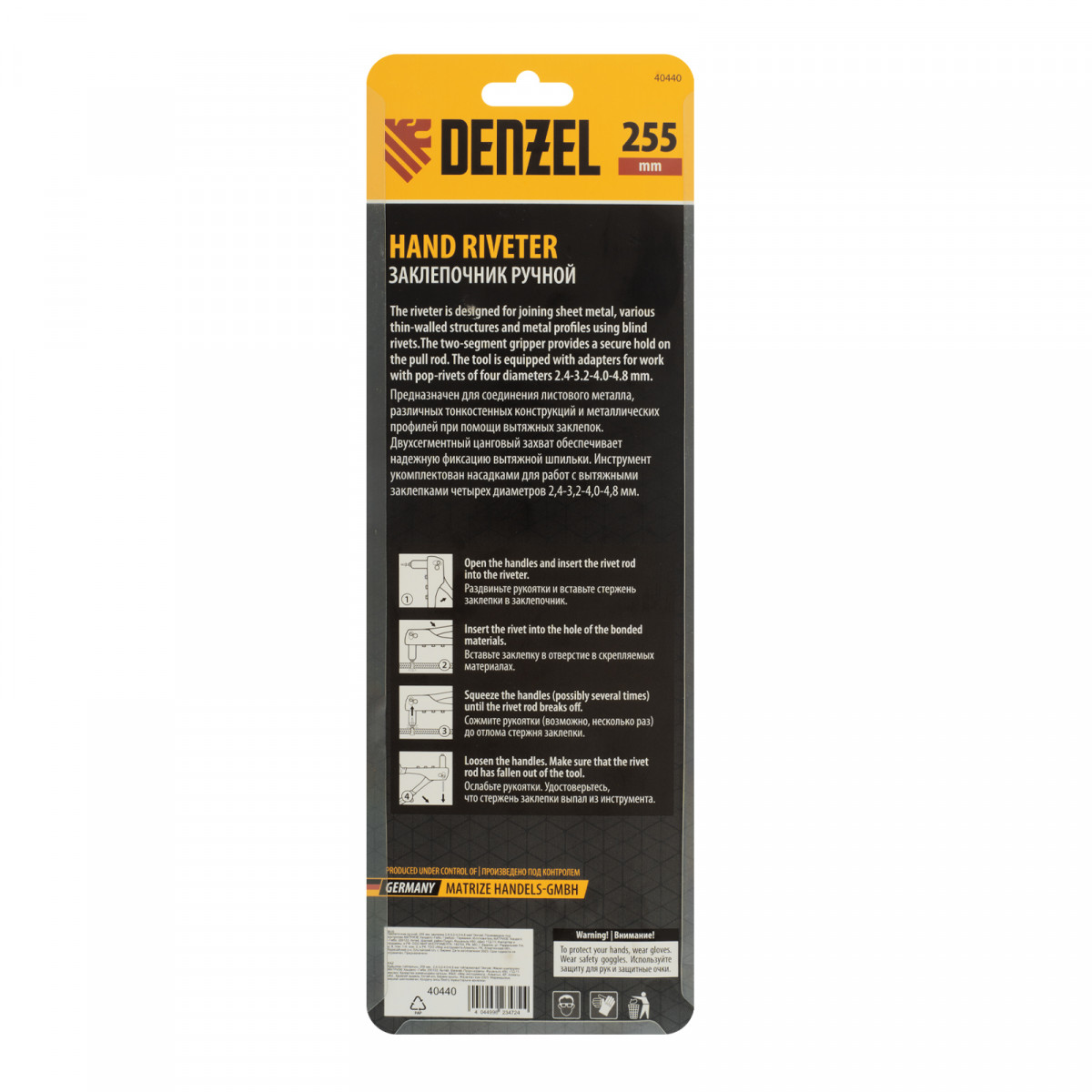Ручной заклепочник Denzel 40440 длиной 255 мм предназначен для работы с алюминиевыми вытяжными заклепками диаметром 2,4-3,2-4,0-4,8 мм, стальными диаметром 2,4-3,2-4,0 мм и вытяжными заклепками из «нержавейки» диаметром 2,4-3,2 мм. Инструмент позволяет соединять листовые металлические заготовки, металлопрофиль и легкие конструкции небольшой толщины. Используется для проведения строительных, ремонтных и монтажных работ как в быту, так и в профессиональной сфере.