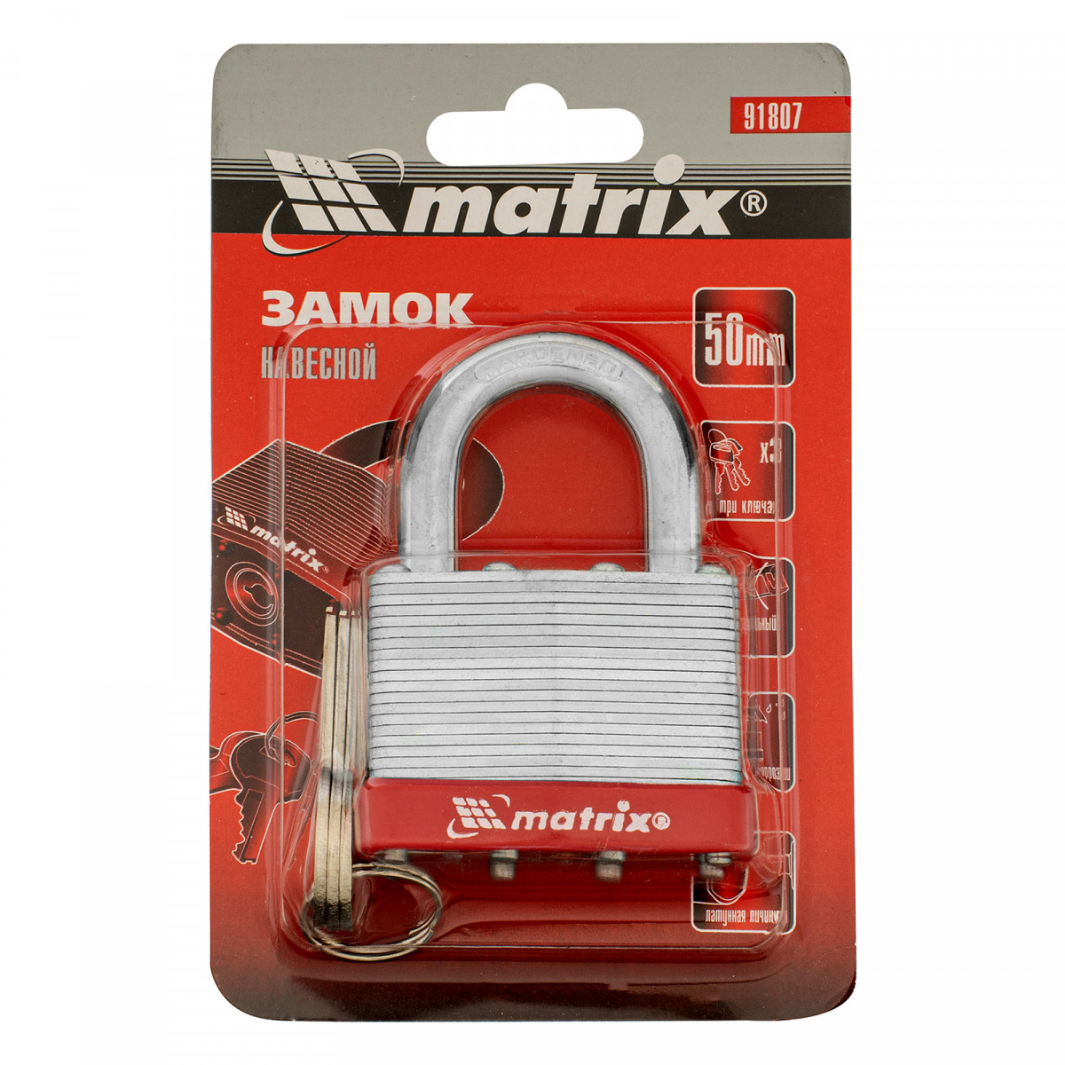 Навесной замок Matrix 91807 шириной 50 мм служит для обеспечения безопасности помещения и ценных вещей. Его можно повесить на ящик, дверь гаража, подсобки, склада, сарая, шкафчика и т.д. Дужку диаметром 9 мм сложно сбить или перекусить.