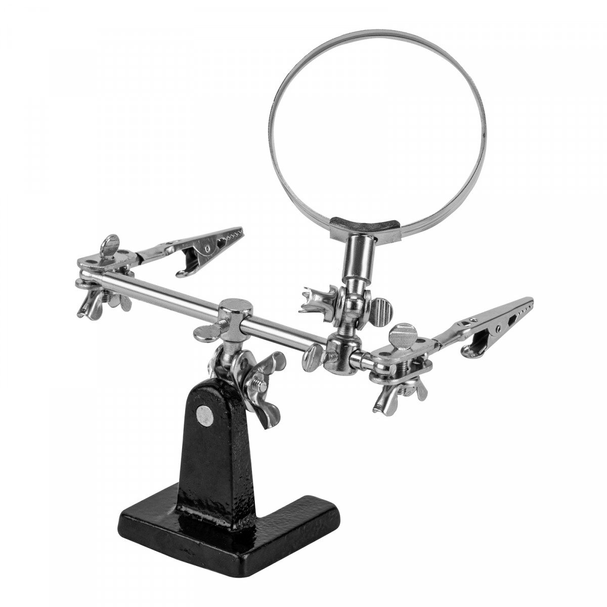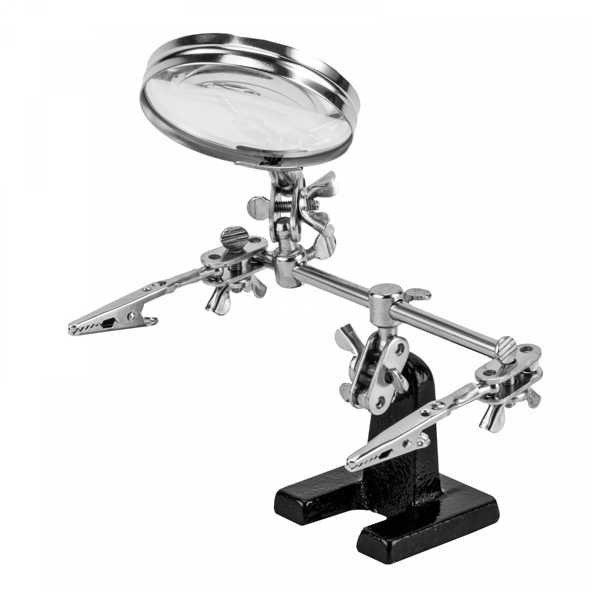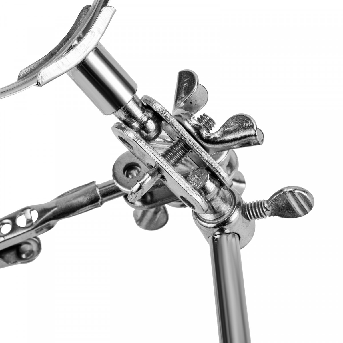 - Фиксация предметов под различными углами — благодаря шарнирным креплениям зажимы и лупу можно установить в любом удобном положении.