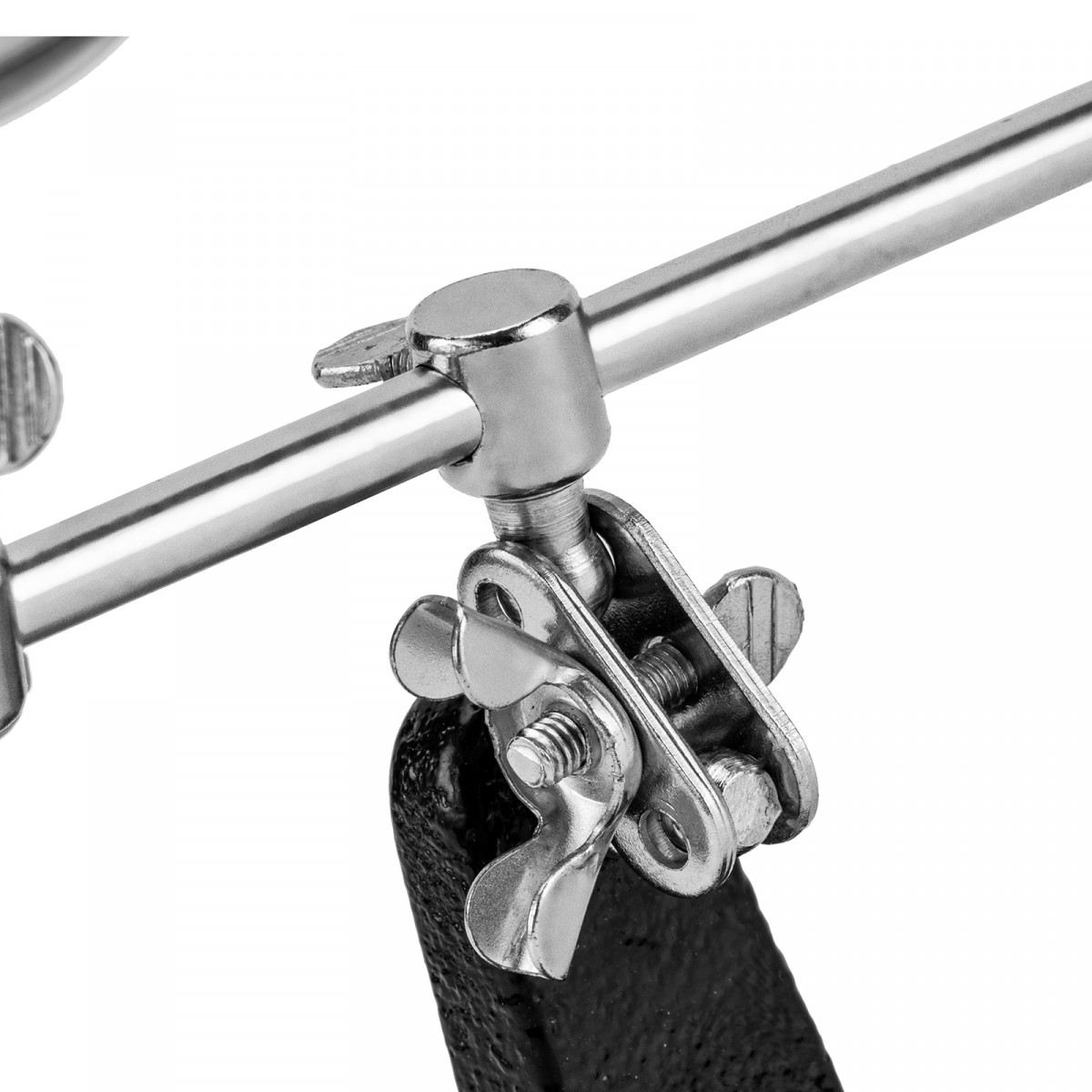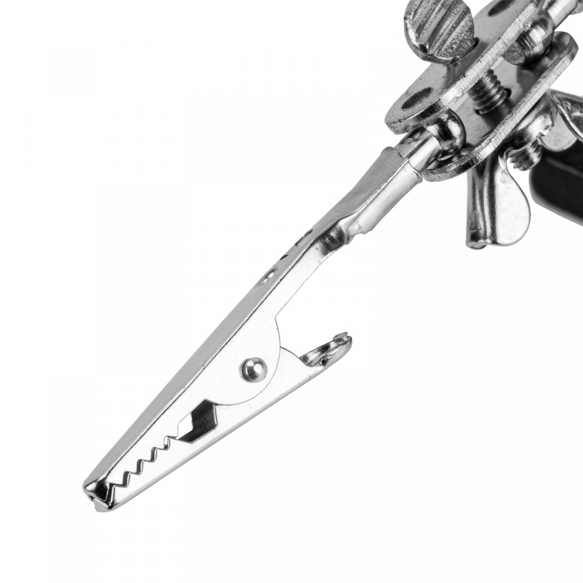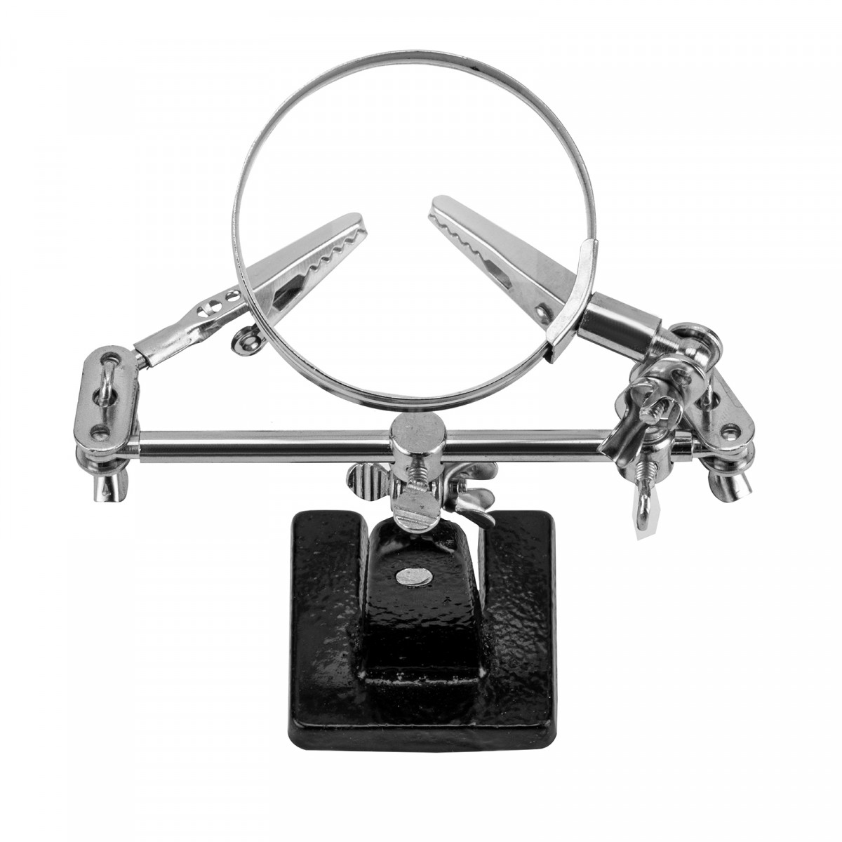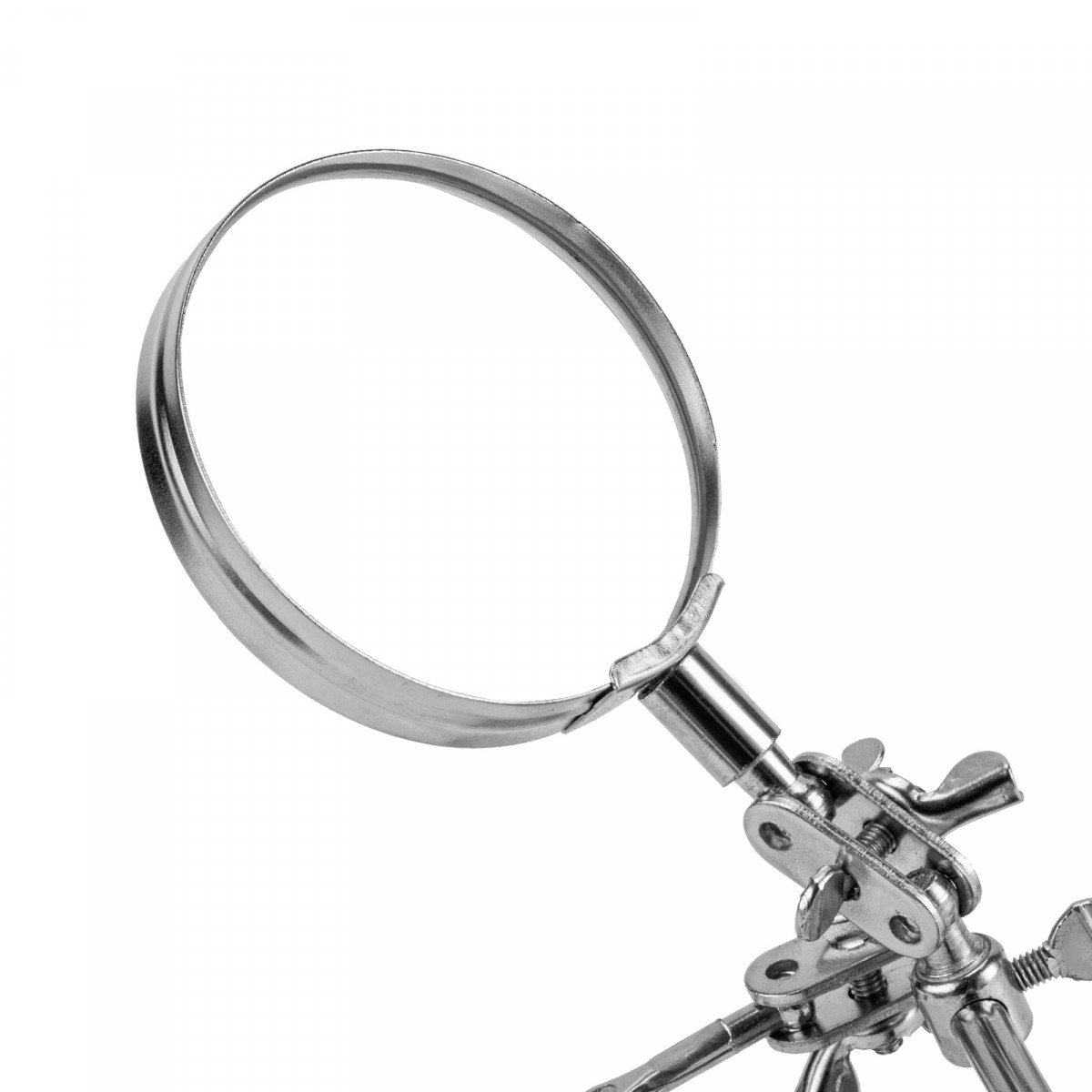 - Фиксация предметов под различными углами — благодаря шарнирным креплениям зажимы и лупу можно установить в любом удобном положении.