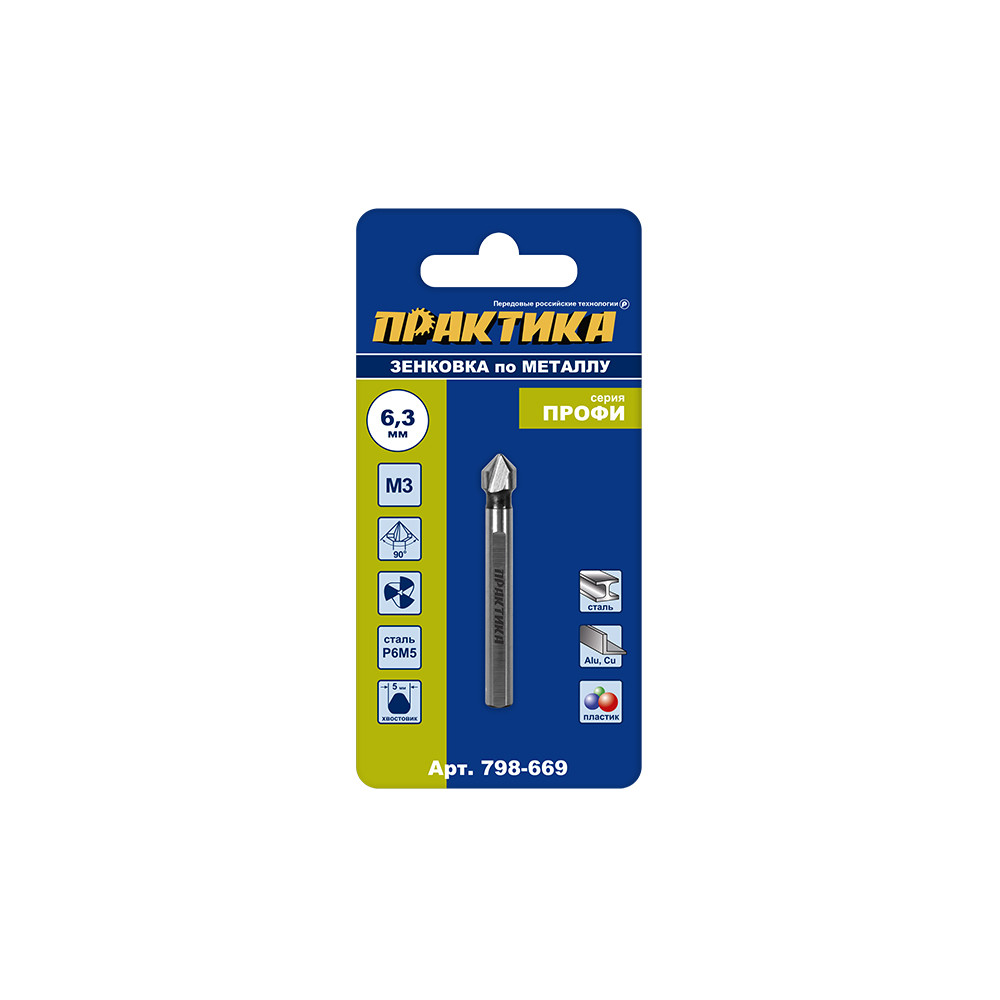 Зенковка по металлу 6.3x45 мм, 90 град., под резьбу М3 ПРАКТИКА 798-669 предназначена для снятия фаски по краю отверстия или формирования конического углубления под потайные головки крепежных элементов в стали с пределом прочности до 900 Н/мм2, сером чугуне, цветных металлах и твердом пластике. Изготовлена из быстрорежущей стали Р6М5 с поверхностным упрочнением режущей кромки.